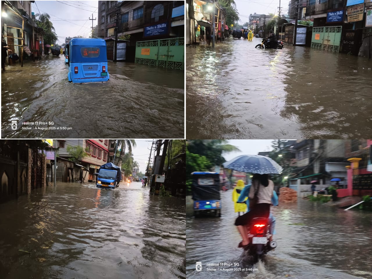 SILCHAR: A fresh spell of intense monsoon rainfall on Monday morning plunged several parts of Silchar into chaos, with extensive waterlogging and artificial flooding restricting traffic movement and causing significant distress among locals. The deluge not only disrupted vehicular movement but inundated several homes and markets as well.
